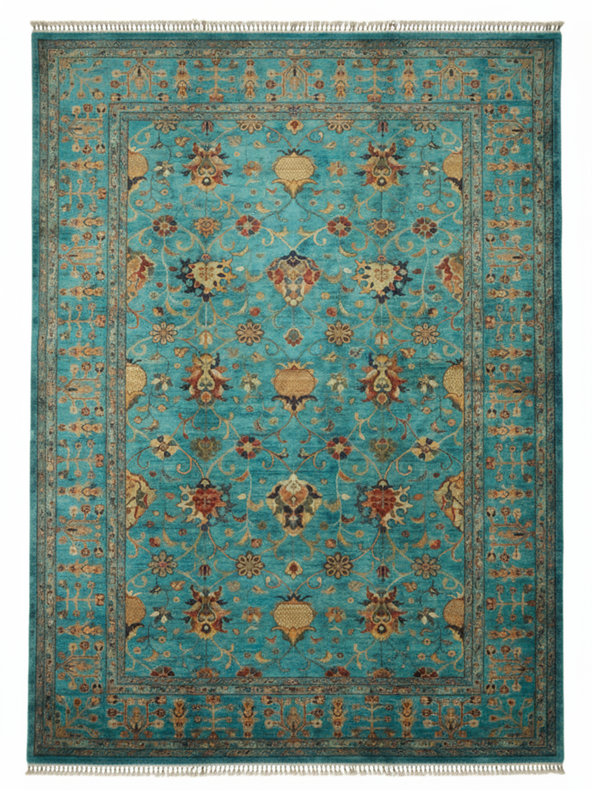 A Vibrant Statement: Traditional Sultan motifs come alive on a captivating turquoise field, creating a dynamic centerpiece that balances classic grandeur with refreshing energy.